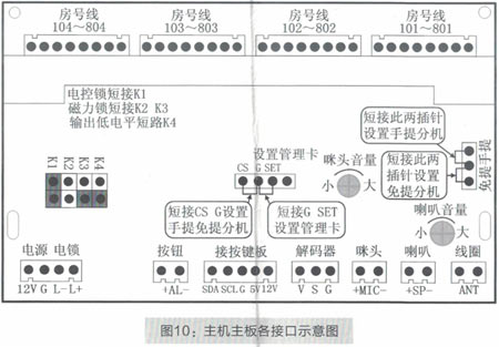 安裝施工調(diào)試時,安裝工作人員可以根據(jù)現(xiàn)場環(huán)境的需要進行一些調(diào)整,比如,通話聲音過大或過小,可以稍微調(diào)整“咪頭音量”的電位器(如圖10所示),一般不用調(diào)整。設(shè)備受施工場所、環(huán)境、線材質(zhì)量等因素的影響,主機或分機可能會出現(xiàn)嘯叫聲。如果出現(xiàn)此類情況,安裝工作人可以通過調(diào)整“咪頭音量”和“喇叭音量”的電位器(如圖10所示)。電位器的調(diào)整方法:逆時針旋轉(zhuǎn)半圈至一圈慢慢調(diào)小,直至嘯叫聲消失,主機和分機都能聽到最大最清晰最洪亮的對話即調(diào)試完畢。