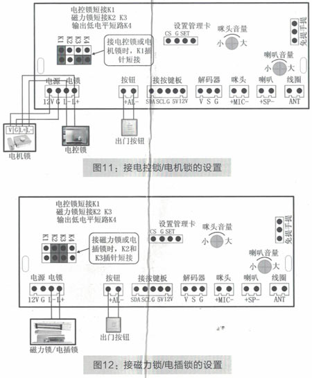 主機主板上的"K1-K4"插針(如圖10所示)是設(shè)置開鎖信號的,出廠時主機默認(rèn)是接普通電鎖的(默認(rèn)是短接K1,如圖11所示),如果使用磁力鎖或電插鎖,那么把插針帽換插到"K2"和"K3"插針的位置(即短接"K2"和"K3"插針,如圖12所示),如果需要輸出低電平信號,那么短接"K4"插針即可.