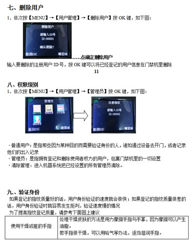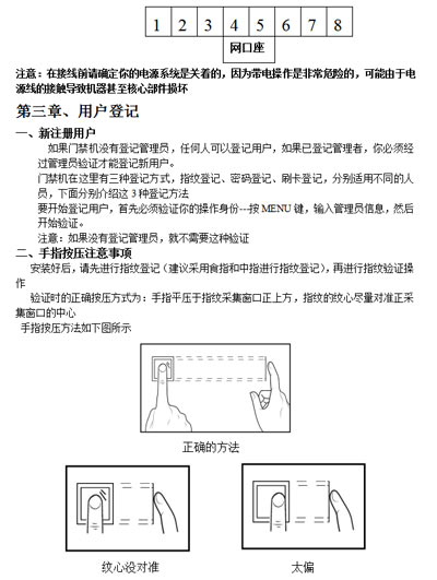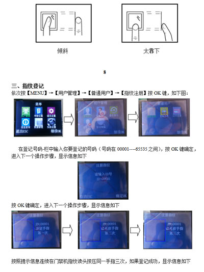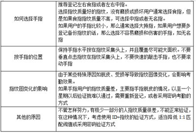 最終指紋還是無(wú)法識(shí)別的用戶(hù),可將該指紋刷次再重新注冊(cè),或注冊(cè)另一枚手指,這樣的用戶(hù)在注冊(cè)時(shí)需要選擇使用質(zhì)量較好的指紋(指紋清晰等),盡量使用手指接觸指紋采集頭面積大一些,注冊(cè)完成后做一下對(duì)比測(cè)試,并建議多注冊(cè)幾枚備用指紋。